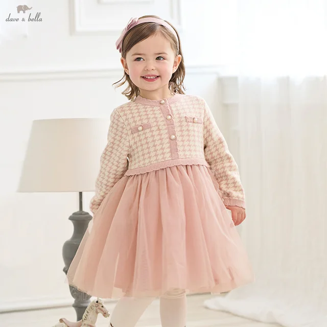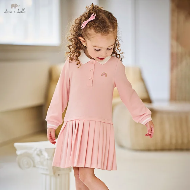 DB3254962 DAVE BELLA Girls Baby Polo Dress Autumn Apparel New Sweet Cute Kids Pink Pleated Skirt Pure Cotton Preppy Style Dress