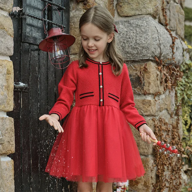 DB3243977 فستان أطفال ديف بيلا خريفي موضة جديدة ساحرة بأكمام طويلة أحمر ملابس العام الجديد فستان أميرات للبنات